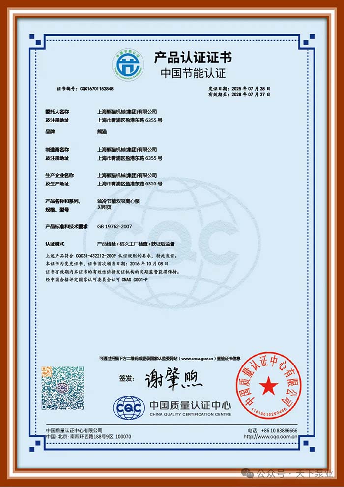 这份由国家认可权威机构 —— 中国质量认证中心(CQC)颁发的续期证书,既是对熊猫 AABS 系列轴冷节能单级双吸离心泵长期稳定节能表现的再次肯定,更是对其核心技术成熟度的高度认可。