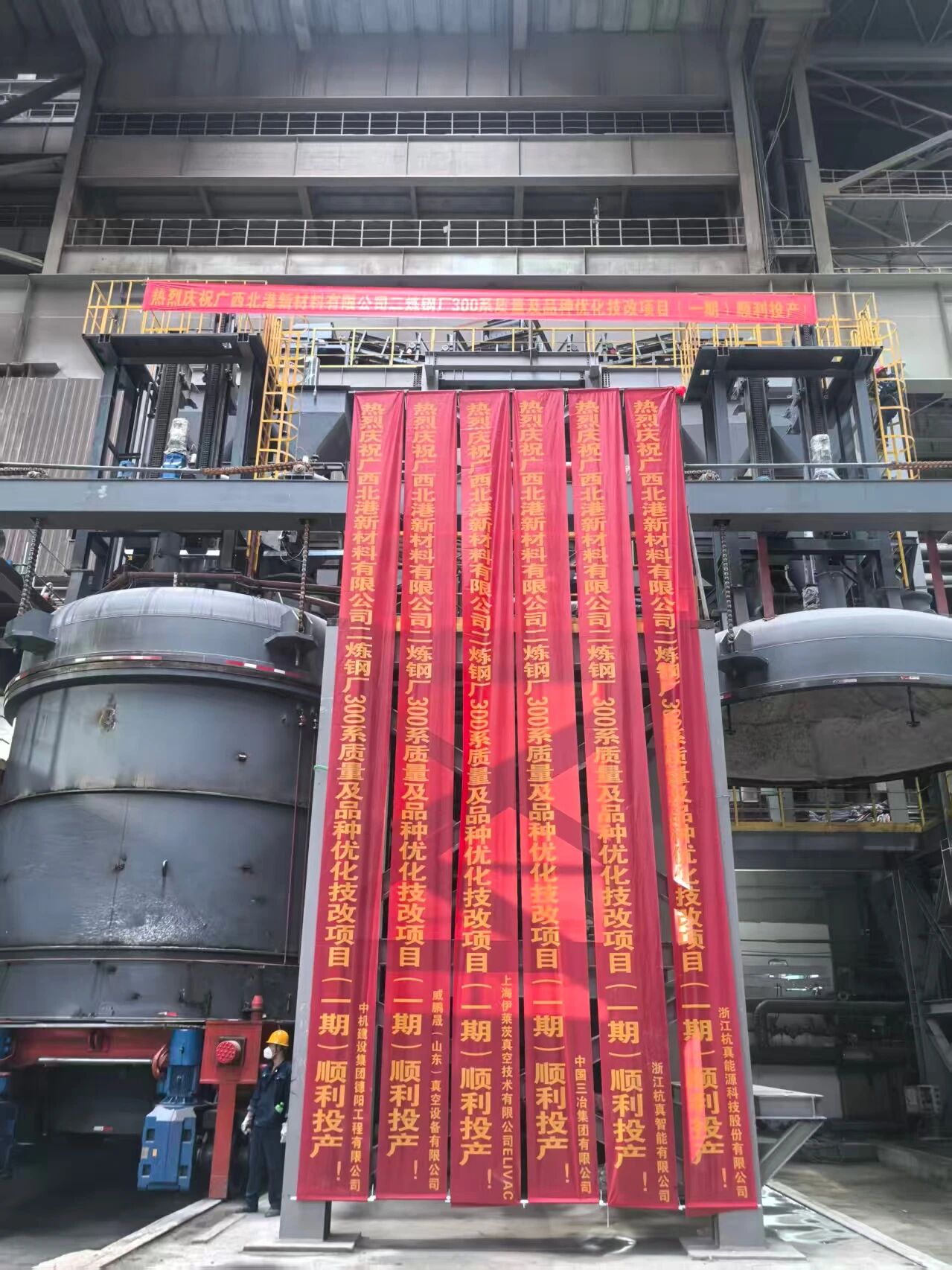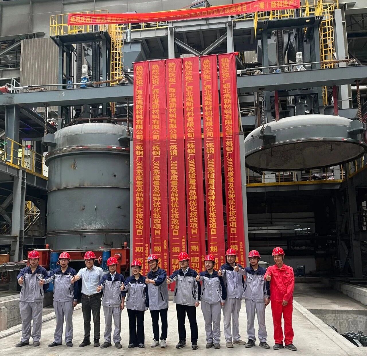 2025年9月19日上午,在广西北港新材料有限公司二炼钢厂,随着钢水包平稳吊入VOD真空罐内进行精炼处理,标志着由杭真能源承建的“90T-VOD真空精炼炉”项目热态性能测试圆满成功。杭真能源总经理任川与广西北港新材料有限公司的领导班子共同到场指导并观摩热试全过程。该项目作为北港新材料产品结构优化与技改升级(一期)的核心环节,不仅为其高端不锈钢生产提供了关键装备支撑,也进一步巩固了杭真能源在冶金真空冶炼设备领域的技术实力。