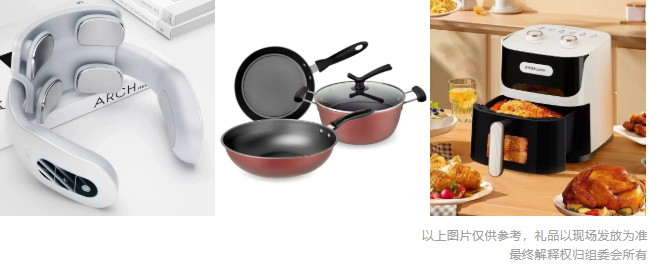 提前预登记观众均可参加,100%中奖,奖品包含电饭煲、电火锅、咖啡机、空气炸锅、电磁炉、热水壶、按摩仪、吸尘器、筋膜枪、净化器、足浴桶、破壁机、蓝牙耳机、体脂秤、定制背包、吹风机、护眼灯、保温杯等30多种精美礼品。