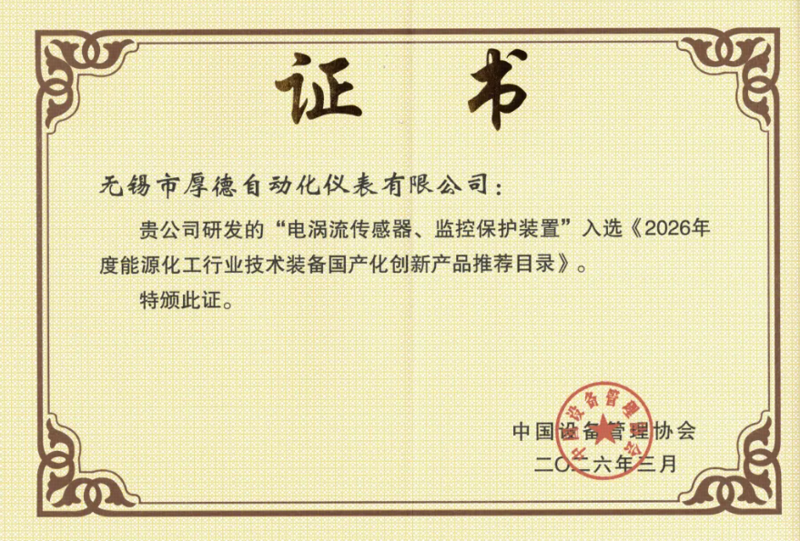 近日,厚德仪表HD系列电涡流传感器、HD3300系列电涡流传感器与HZD-8500D系列监控保护装置成功入选《2026年度能源化工行业技术装备国产化创新产品推荐目录》,这不仅是对厚德产品技术实力的权威认可,更是公司在能源化工领域国产化进程中迈出的坚实一步。