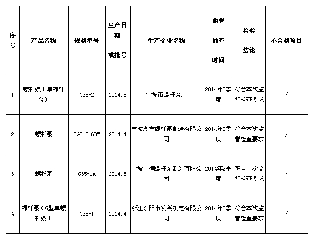 14日从浙江省质量技术监督局获悉,该局近期组织开展了全省螺杆泵产品飞行监督抽查,抽查了宁波、金华地区4家企业的4批次螺杆泵产品,不合格0批次,批次不合格率为0。