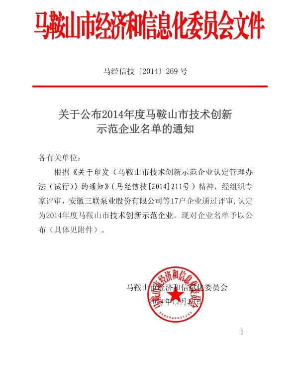 三联泵业荣获马鞍山市技术创新示范企业称号
