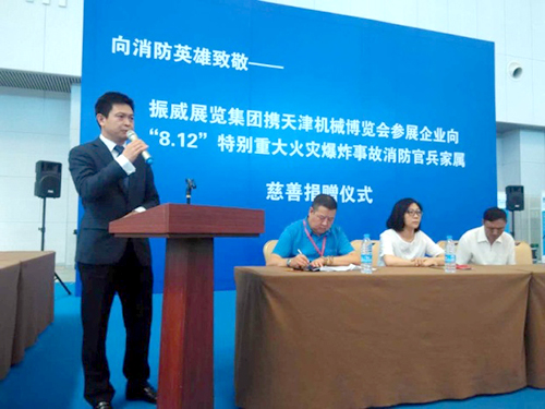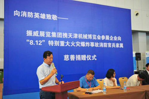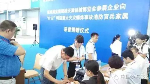 天津港“8•12”特别重大火灾爆炸事故发生后,英勇无畏的消防战士用他们的血肉筑起了生命通道。社会各界纷纷伸出援手,向在此次事故中牺牲的消防官兵及家属表达敬意和哀悼。8月21日,第十一届天津机博会闭幕,中国国际商会、中国会展经济研究会、天津会展行业协会、振威展览、上海普盈贸易、中宝物流、无锡庆源、集发源机械贸易、定兴肇兴、日泰寿海、大族激光等相关主办机构与参展企业在展会现场举办捐赠仪式,共向遇难消防官兵家属捐款近百万元。