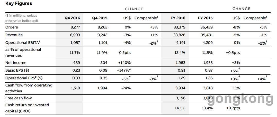 ABB集团首席执行官史毕福先生说: “2016年,我们取得了令人瞩目的进步,ABB转变为更加关注用户需求、精简高效的数字化技术领导者。ABB将通过持续专注生产力提升和成本控制来实现利润增长。”