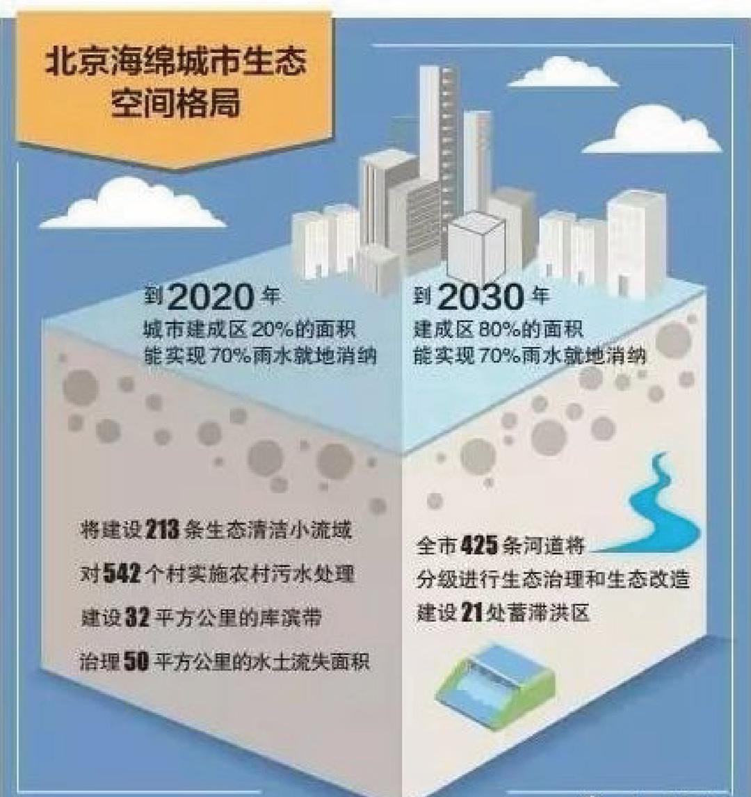 2017年底,北京市发布海绵城市建设意见,提到通过海绵城市建设,综合采取“渗、滞、蓄、净、用、排”等措施,最大限度地减少城市开发建设对生态环境的影响,将70%的降雨就地消纳和利用。并提出到2020年,城市建成区20%以上的面积达到目标要求。