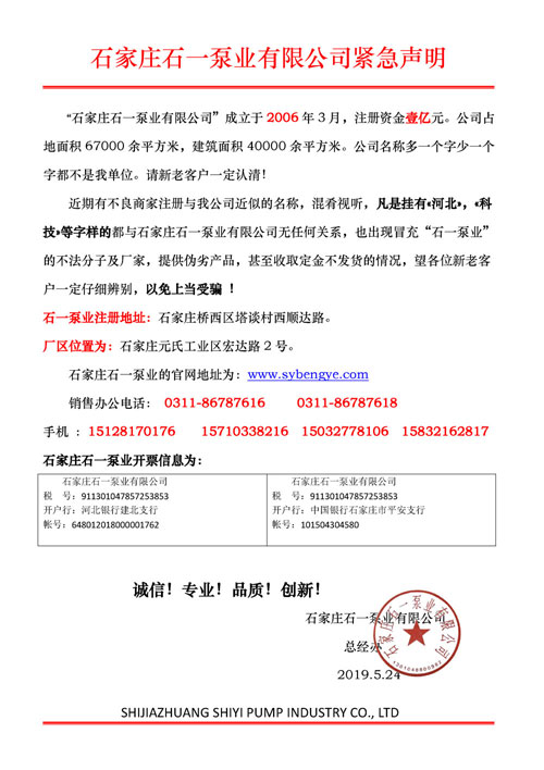 近期有很多客户反映到公司,发现市场上出现一些冒充“石一泵业”的厂家及不法分子,打着“石一泵业”的招牌提供伪劣产品,甚至收取了定金不给客户货物的情况,望各位新老客户一定慎重合作 !