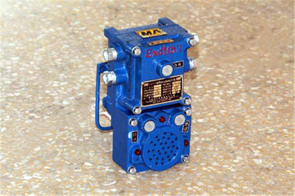 该产品集打点按钮、防爆灯、防爆电铃、三通接线盒为一体,隔爆接线腔内设打点按钮,并有三个出线口,取代了打点按钮和三通接线盒,用高亮发光二极管和矿用防潮扬声器取代了防爆灯和隔爆电铃。通过电源连线实现载波对讲通讯。