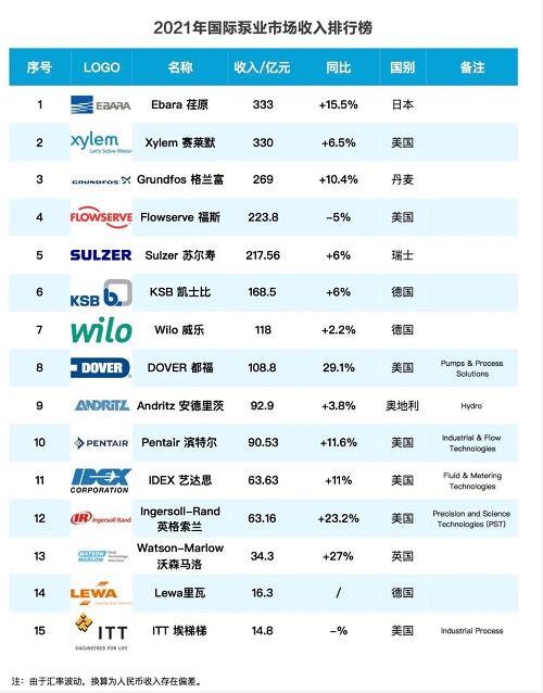 总体来看,在统计的15家企业中,有一半企业实现两位数增长,有三家企业实现20+%的增长。另外,占据全球泵业市场榜单前三名依然是荏原、赛莱默和格兰富。