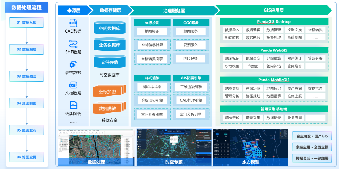 PandaGIS是熊猫自主研发、具有完全知识产权的国产GIS平台,基于熊猫GCK-三端融合架构,代码全自研、系统安全自主可控;同时面向水务GIS专业领域,平台将轻量化做到极致,无论是数据分析处理,还是出图展示均能展现出优异性能。