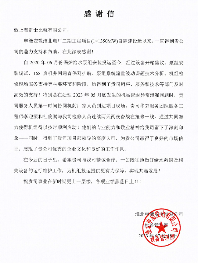 就在近期,我们收到了淮北申能发电有限公司(平山电厂)的一封感谢信,客户对我们服务工程师在现场的表现高度赞赏,体现了卓越服务事业部高效、专业的服务理念,也完美展现了服务工程师处事的稳健、业务的纯熟和对客户的精益求精。