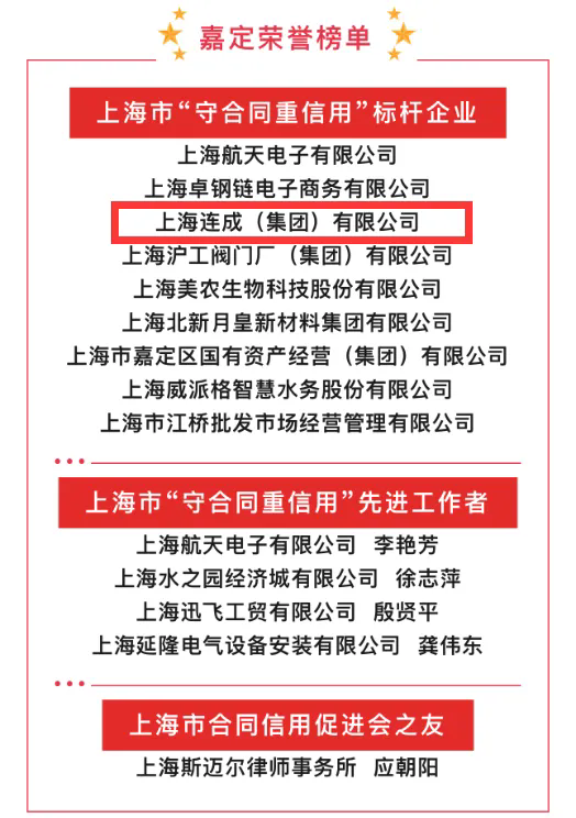 会上,上海市市场监督管理局二级巡视员陶爱莲发表了热情洋溢的讲话。上海市合同信用促进会会长乐贵忠发表主旨演讲,回顾了市合同信用促进会自2004年8月31日成立以来的发展历程和取得的不凡成就,并表达了对未来的期许和展望。同时,现场对104家上海市“守合同重信用”活动标杆企业、49位上海市“守合同重信用”活动先进工作者、19位上海市合同信用促进会之友进行了表彰,并举行了颁奖仪式。上海连成(集团)有限公司喜获“上海市‘守合同重信用’标杆企业”。
