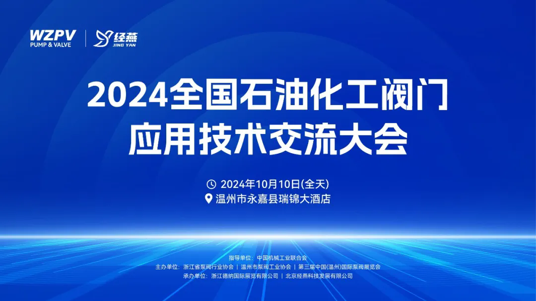 为进一步提升工业阀门产业的技术含量,推动产业智能化、环保化、高端化的发展进程,构建更为完整的全产业链展示和沟通平台,由中国机械工业联合会指导,浙江省泵阀行业协会、温州市泵阀工业协会、第三届中国(温州)国际泵阀展览会主办,浙江德纳国际展览有限公司、北京经燕科技发展有限公司承办的2024全国石油化工阀门应用技术交流大会将于10月10日在永嘉瑞锦大酒店隆重举办。