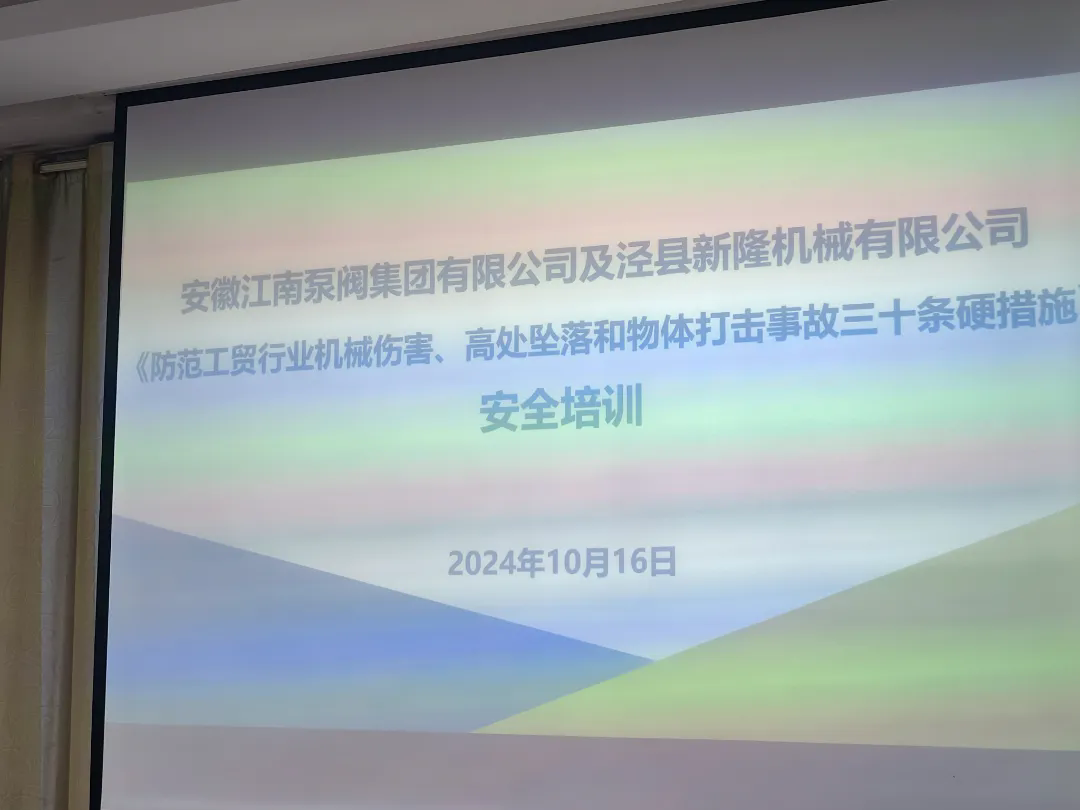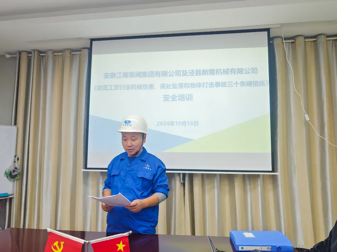 随后,江南泵阀集团联合泾县新隆机械厂开展《防范工贸行业机械伤害、高处坠落和物体打击事故三十条硬措施》专题培训,让全体员工对安全生产工作的重要性有了更深的了解。