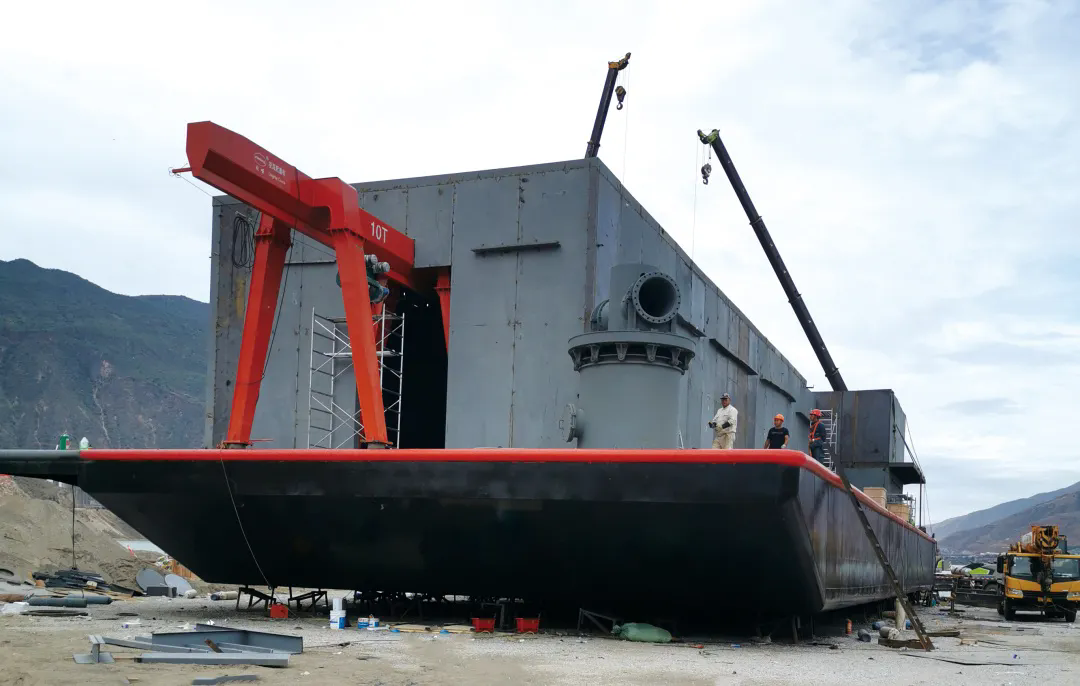 浮坞泵房由船体、水机和电气设备等组成,泵房长54.0m,宽17.7m,型深3.5m(浮坞尺寸为暂定),整个泵房采用钢框架结构。主厂房为单层布置,主要布置4台卧式离心水泵及电气设备。不设置专门的安装间,设有浮台可转运至二级泵站,泵组检修考虑同二级站共用安装间。