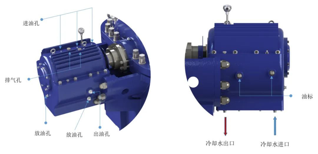 改进后的轴承部件由滑动轴承和滚动轴承组成,滑动轴承承受径向力,滚动轴承承受轴向力;滚动轴承由一对推力调心滚子轴承组成,推力调心滚子推力轴承远强于角接触轴承组合,具有自动调心功能,因此可以承受较大的对准误差、重载轴向力,可保证承载轴向力能力更强,使用可靠、寿命长;新型滑动轴承采用球面轴瓦,当轴因载荷变形时,轴瓦的球面能自动调心;整体采用压力循环润滑,稀油站利用油泵将润滑油从油池中抽出来,经过管道压送到所需润滑的轴承处,油通过轴承润滑后,在轴承体油室中不会形成集油,又通过回油管路回到原来的油池中,形成循环油系统,润滑方法可靠、效果好,并能很好地冷却轴承;新型滚动轴承还配置两个甩油环,保证因稀油站故障引起的轴承缺油损坏;本实用新型轴承体下方设计冷却水腔室结构保证油温度冷却效果,轴承上盖设计散热片,保证轴承散热;新型油密封采用轴承隔离器密封,压装轴承隔离器更可靠,保证润滑油不泄漏。