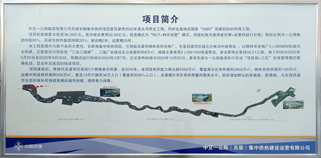 中交一公局集团有限公司柳林华光电厂吕梁市区长输集中供热项目是吕梁市的一项重要民生工程,也是积极响应国家“双碳”目标的环保工程。该项目是国内为数不多的大管径、长距离集中供热项目,从吕梁市柳林县华光电厂出发,向东延伸至吕梁市区域北沙麻沟中继泵站,以柳林华光电厂2*600MW机组为主热源。