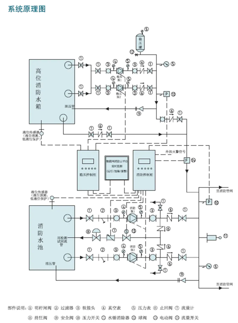 物联网消防给水系统以传统消防给水设施为基础,增设物联网模块、相关传感器、硬件终端,通过物联网控制柜将采集的水泵运行参数传送至物联网平台,从而实现对流量、扬程、转速、水泵、电动阀门等数据的远程实时监控以及动态管理。