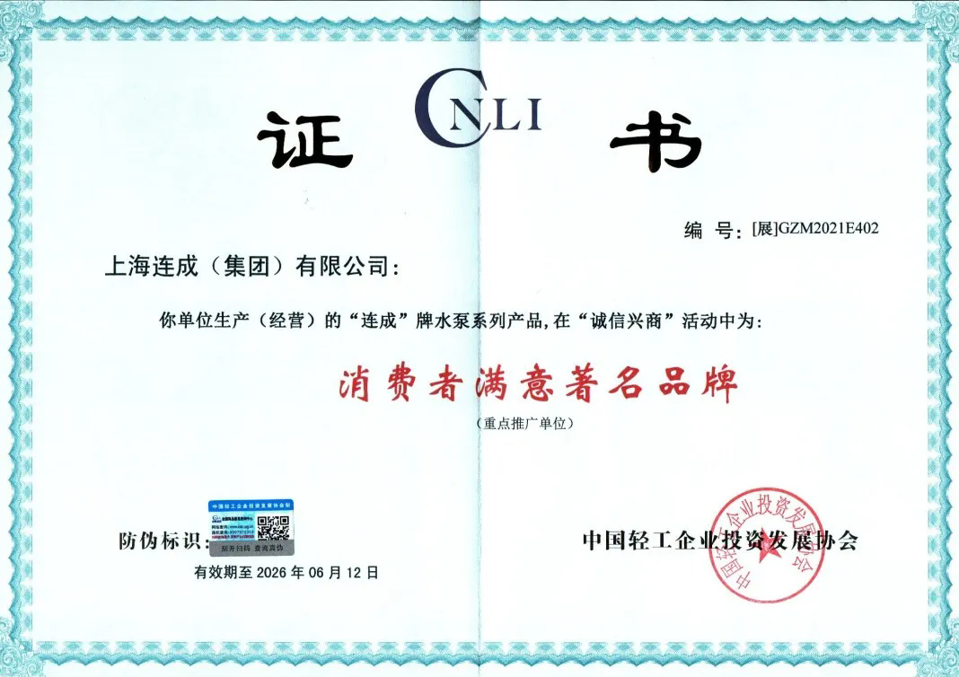 通过公开、公平、公正的申报流程,经过严格的审核和评估,上海连成(集团)有限公司被中国轻工企业投资发展协会在“诚信兴商”活动中认定为“消费者满意著名品牌”重点推广单位。