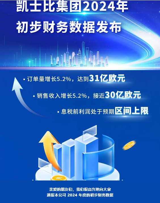 2024 年,凯士比的销售收入增长 5.2%, 达到 29.65 亿欧元 (上一年度为 28.19 亿欧元), 其中 2024 年第四季度的销售收入为 7.94 亿欧元 (+12.6%)。