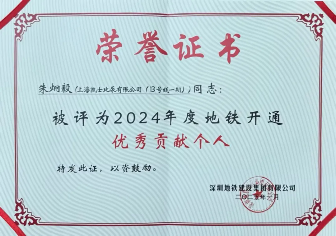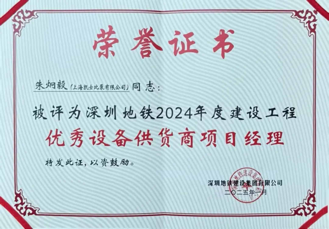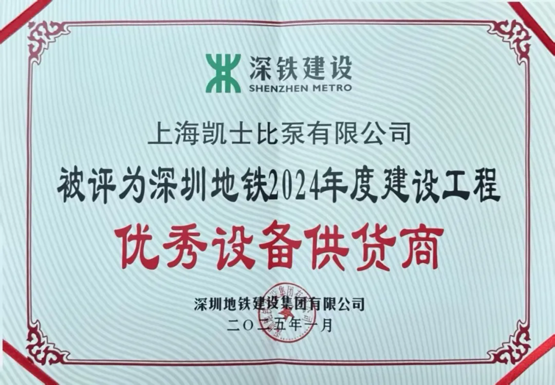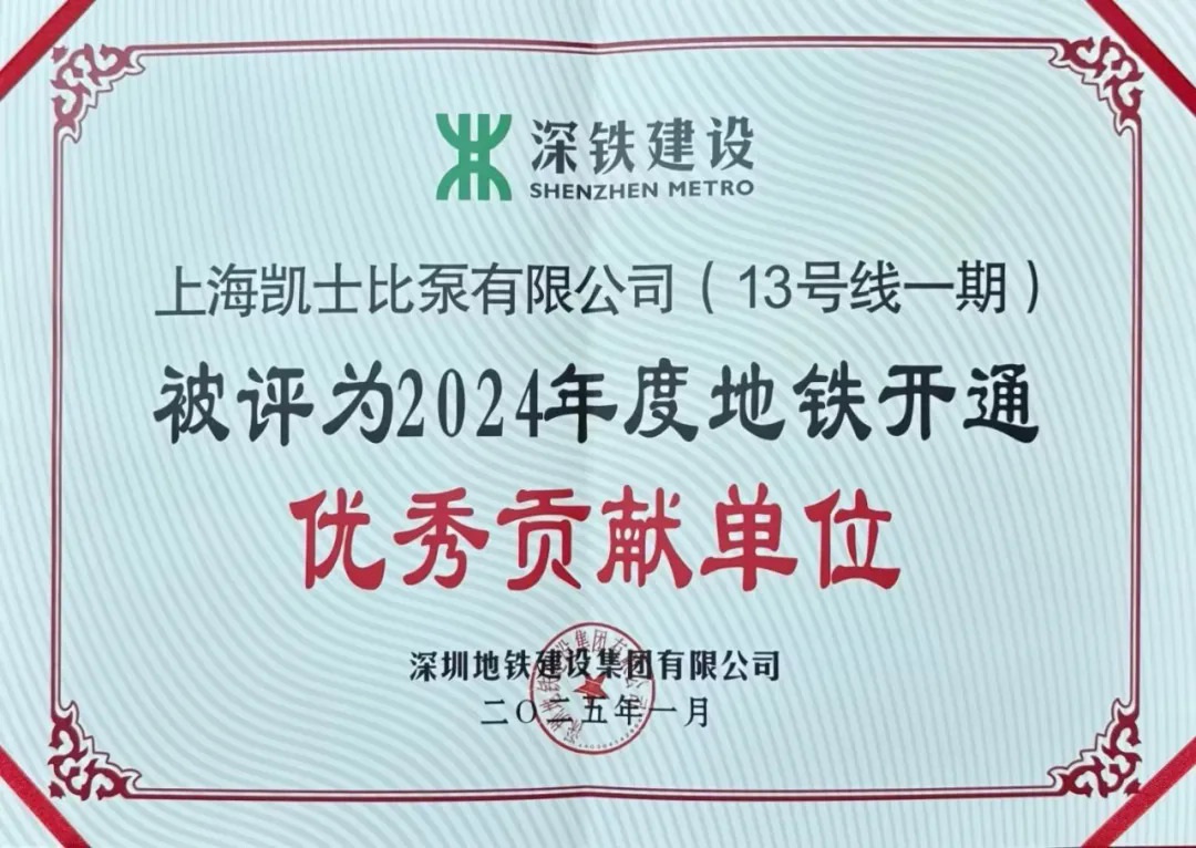 近日,从深圳地铁建设集团传来喜讯,上海凯士比泵有限公司凭借在深圳地铁13号线建设中的优异表现,荣获“优秀贡献单位”和“优秀设备供货商”称号。同时,凯士比上海总经理朱炯毅先生也因其突出贡献,被评为“优秀贡献个人”及“优秀设备供货商项目经理”。