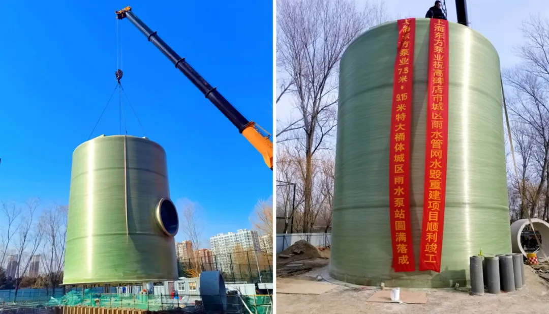 ▸ 4台DFZQ800-70潜水轴流泵联动7500mm玻璃钢泵井,极端天气稳如磐石;