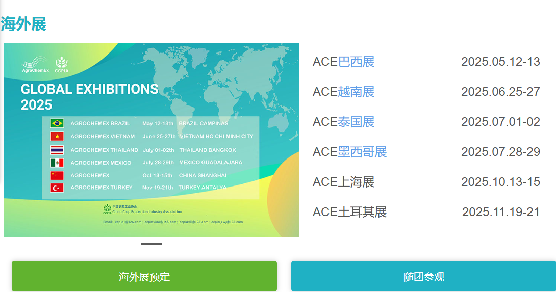 全国农药交流会暨国际农化产品展览会(AgroChemEx,简称ACE农化展)是由中国农药工业协会主办的全球知名的农化商贸和信息交流的专业平台。主办方积极响应“一带一路”号召,在国内外举办专业性农化专业展会。开展国际农化市场信息及植保科技交流,推动中国农药、助剂、包装材料、生产设备、施药设备等领域的优势品牌走向世界,推动中国农药行业进出口贸易的健康可持续。展示前沿的创新技术和综合解决方案, 是行业专业人士寻找新技术和新产品、了解市场先机的一站式商贸、技术和交流平台。