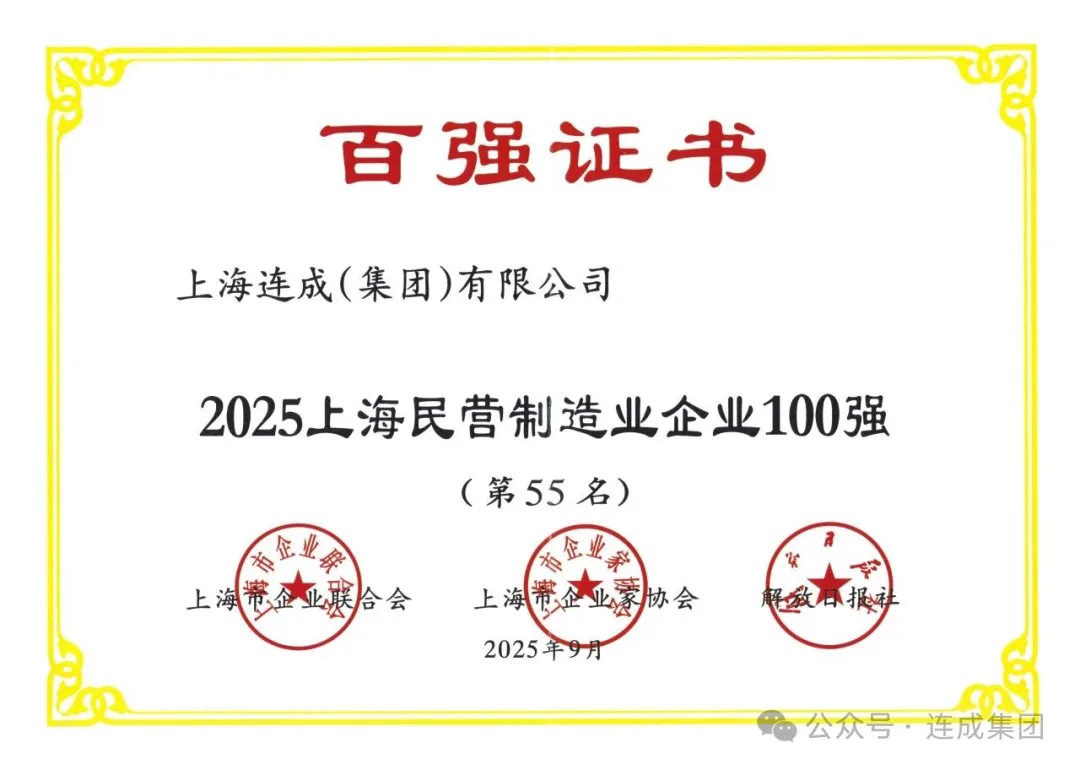 上海连成(集团)有限公司荣膺“2025上海民营制造业企业100强”第55名、“2025上海制造业企业100强”第87名。两项榜单由上海市企业联合会、市企业家协会、市经济团体联合会和解放日报联合发布,并于2025年9月正式揭晓。