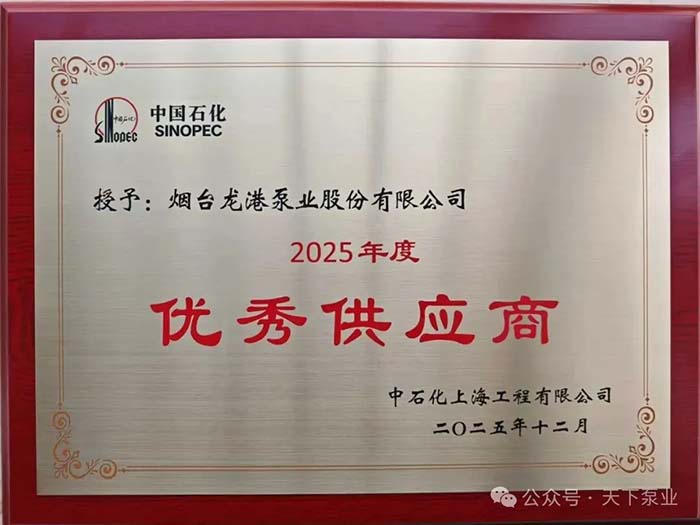 近日,烟台龙港泵业股份有限公司凭借过硬的产品实力与优质的服务水准,从众多合作伙伴中脱颖而出,荣获中石化上海工程有限公司授予的2025年度“优秀供应商”称号。这一殊荣不仅是对双方长期紧密合作的高度认可,更彰显了龙港股份始终以客户需求为核心、以品质为生命线的企业理念和不懈追求。