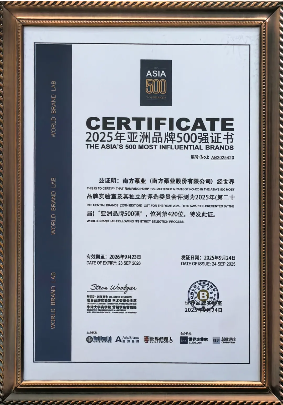 一年来,南方泵业斩获各类荣誉奖项71项,其中国家级25个、省级27个、市级19个。获评“制造业单项冠军企业”“国家绿色工厂”“全国国标五星级售后服务企业”等,斩获新国标(GB19762-2025)“全国首张1级能效认证证书”,连续三年荣获“机械工业大型重点骨干企业”,成为中国泵行业首家上榜“亚洲品牌500强”企业,丰硕的荣誉奖项见证了企业科技创新的硬实力与品牌影响力。