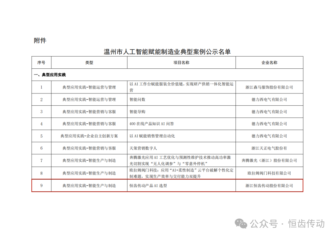 2026年2月24日,浙江恒齿传动股份有限公司(以下简称为“恒齿传动”)“恒齿传动产品AI选型”项目成功入选“温州市人工智能赋能制造业典型案例名单”。作为深耕减速机领域十余年的国家高新技术企业,恒齿传动始终以创新驱动发展,积极探索人工智能与制造业深度融合的新路径,此次入选是对恒齿智能化转型成果的高度肯定。