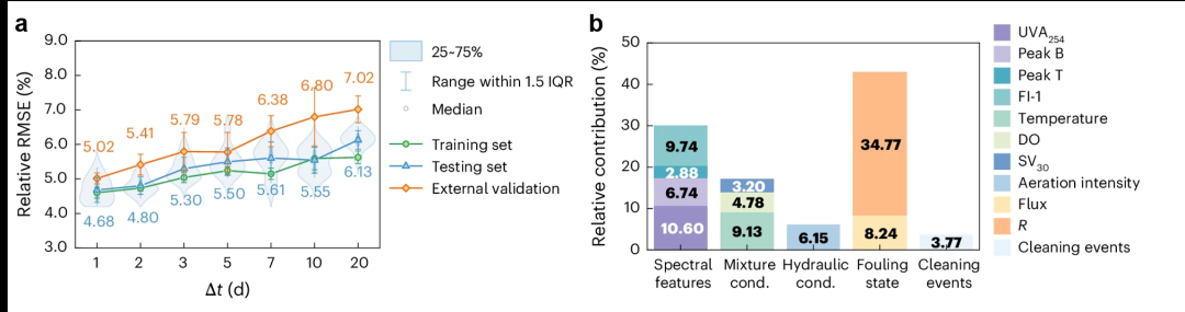 团队以光谱指纹表征溶解性有机物性质,结合胶体与颗粒特性、运行工况、膜运行与污染状态及清洗事件等信息作为模型输入,对不同时间滞后条件下的膜污染发展趋势进行预测。基于光谱指纹驱动的机器学习模型,在小样本条件下实现了膜污染发展趋势的高效预测,可有效预测5-7天后的膜累积阻力,并展现出良好的跨膜池泛化能力。
