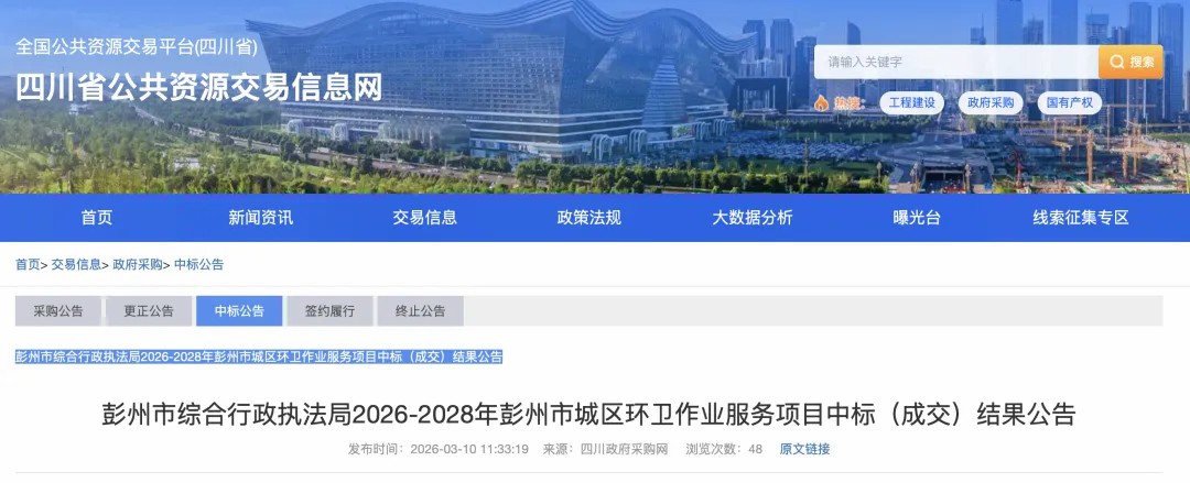 近日,中国固废网从E20环境平台标讯采集系统E标通获悉,彭州市城区环卫作业服务项目发布中标结果公告,成都湔江城市运营服务有限公司中标该项目,服务时间3年,合同一年一签。预估项目总额约2.757亿元。