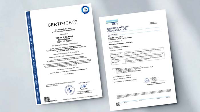 如今,这份先发优势已结出了丰硕果实:凯士比成为了全球首家根据欧盟《压力设备指令》获得零部件增材制造TÜV认证的制造商。这不仅是行业里程碑,更是对KSB产品极致安全性与可靠性的最高认可。