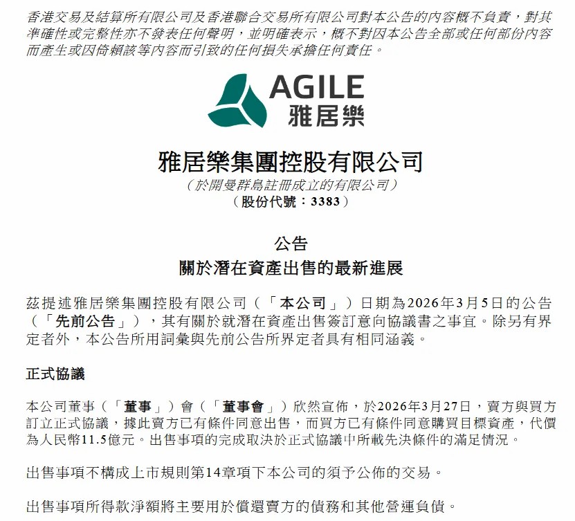 3月27日,雅居乐集团发布公告称,2026年3月5日(交易时段后),玉林溢华环保科技有限公司(“买方”)与公司的附属公司玉林市新滔环保科技有限公司(“卖方”)订立意向协议书。据此,买方有意以现金向卖方收购土地、厂房等不动产,以及设备、管网、在建工程等运营固定资产。3月27日,卖方与买方订立正式协议,买方已有条件同意购买目标资产,代价为人民币11.5亿元。