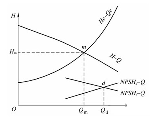 水泵安装到特定管路系统中,实际工作扬程和流量不仅与泵本身的性能有关,还与管路的特性有关。管路的He-Qe曲线与泵的H-Q曲线的交点是泵的运行工况点(见图1),即m点对应的流量Qm和扬程Hm,就是泵最佳的流量和扬程;管路的NPSHa-Q曲线和泵的NPSHr-Q曲线的交点是输送系统的临界气蚀点,泵的工作流量必须小于Qd,否则会发生气蚀。